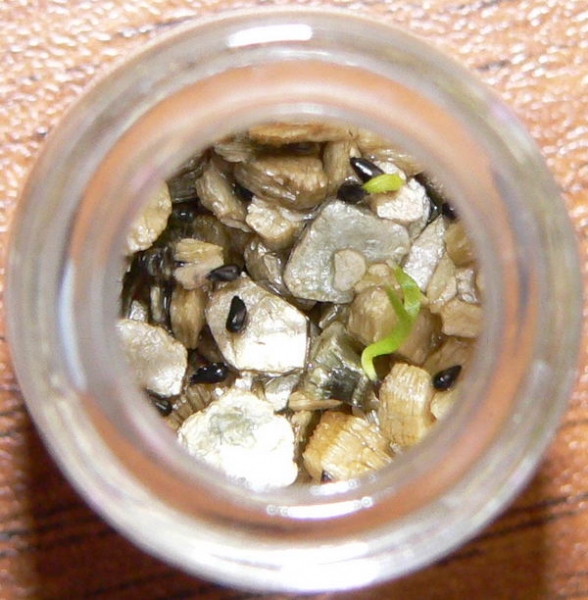 Посадил я эти семена в пенициллиновые флакончики заполненные вермикулитом, смоченным дистиллированной водой, до состояния влажности, без свободной воды. Положил туда семена, и закрыл пробкой. Прошло 30дней. Сегодня заметил появление проростка, и 2-х проклюнувшихся семян. Вот фотография.