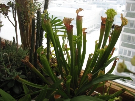 На фотографии моя сарацения, точно вид назвать не могу, но из самых простых. Бывает обычная (как моя), flava и alba, т.е. с желтыми и белыми окончаниями трубок-листьев.