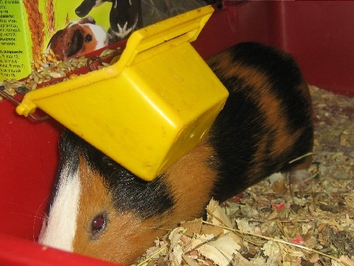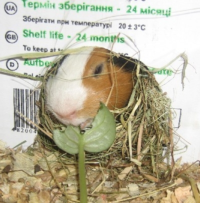 Миша практически все время теперь сидит в этой коробке, пардон, в этом домике. Выходит только если мы его выманиваем или если захотелось пожевать чего-нибудь. Хотя сено он жует не выходя из дома.