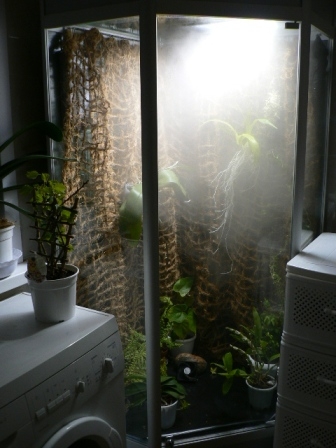 Света вейчас действительно маловато.МГ 150вт.А светильник,который предусмотрен с лампой ДНаТ 400вт-достаточно.Разместим над орхидариумом,греется она сильно и влаги боится.Она еще всю ванную и пол-огорода освещает.Как бы не обжечь растения...На днях куплю люксметр-буду мерить освещенность,а по результатам и жильцов подбирать.Одно пока ясно.Температура будет не низкая,сейчас внизу 21,вверху 26,а лето впереди.Кого посоветуете?Влажность высокая.У.з.увлажнитель установлен снаружи,внутрь от него идет труба,внизу установлен один кулер.Вот увлажнитель включен.Влажность 95%
