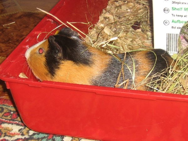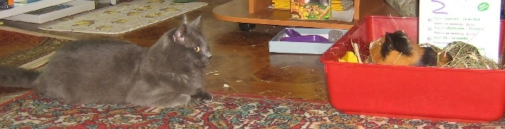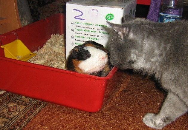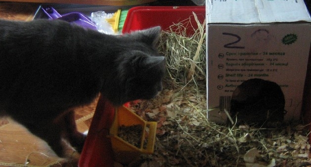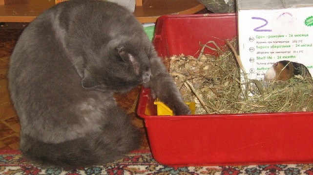 Коту скучно дома. Он пристает к Мишке, чтобы поиграться. То с одной стороны посидит, то с другой, то прямо в дырку пытается заглянуть. Уже и сверху лазил, лапой по крыше тыкал-стучал. Типа вызывает Михасыка: "Выходи, поиграем!" А Мишка только морду чуть-чуть показывает, вроде дразнится. Смоки уже и в сам террариум влазил, а Мишка сидит себе в домике и в ус не дует. Котик и в кормушку свинскую влез и вокруг потоптался. Свин не реагирует. И тогда Смоки совершил ошибку. Он попытался засунуть лапу вовнутрь домика. Вот тут я очень пожалела, что у меня нет кинокамеры. События развивались так стремительно, что фотоаппарат не справлялся с задачей. Некоторые фото получились совсем смазанными. Так что попрошу поверить мне на слово.