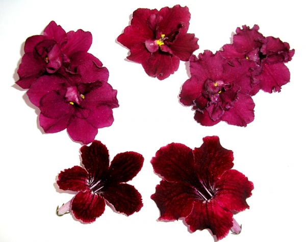 На фото слева два цветка ЕК-Бой Быков, посередине один цветочек ЕК-Красный бархат, справа два цветка - Hot Spot (Sorano).