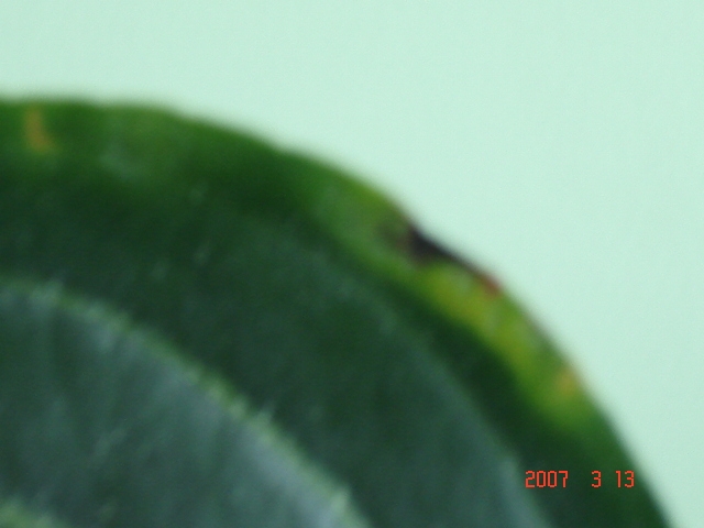 Потеплело... А так вроде ничего. Жалко, фотографии плохо у меня получаются. Пятна прозрачные какие-то. Появляется сперва одно-два, потом они сливаются, а потом все постепенно сохнет. А потом наполовину засохший лист опадает