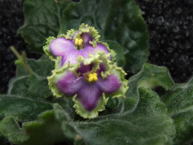 Темно лавандовые простые и полумахровые с бахромчатыми краями звезды с концентрическими разводами светлой и темно зеленой окраски. Темно зеленая волнистая листва формирует изящную розетку.
