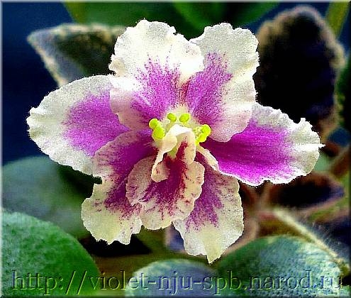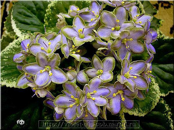 Обильнейшая шапка искрящихся голубовато-лавандовых цветков в форме подснежников с широкими тёмно-зелёными краями на фоне нарядной изумрудно-зелёной листвы с яркими белыми зубчиками. Самый необычный сорт среди фиалок и самый долгоцветущий!