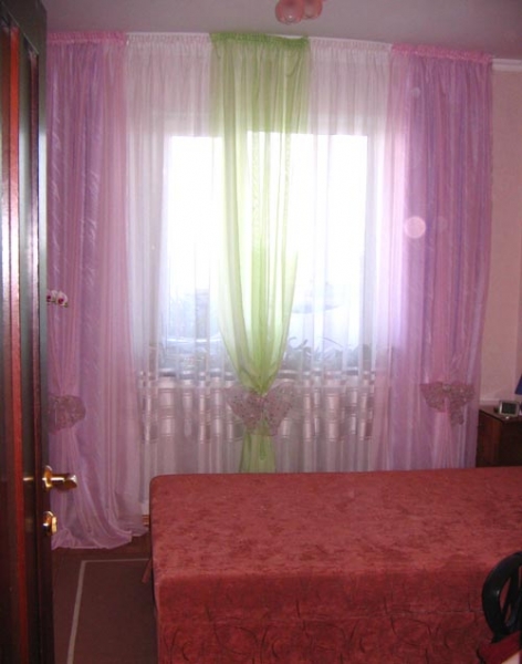 Ну и шторки крупным планом, по просьбе трудящихся) На самом деле видны только тюли-драпировки, шторки спрятаны сзади) и функцию несут, если что, и глаза не мозолят, вся комната воздушная, мягкая, подсвеченные розовые драпировки дают "рассветтный" свет, салатовая вставка посредине предназначена для свежей, бодрящей струи в интерьере и настроении. Далее, на фото не очень видно - карниз потолочный огромными усилиями привинчен полукругом - даёт визуальное расширение пространства(подоконники широкие, если привинтить прямо - украли бы у комнаты 25*320 = 0,8 кв.м.), делает интерьер ещё более обтекаемым, и создаёт ложный намёк на возможную лоджию за ним (обман зрения - хотя карниз вогнут в помещение, иногда кажется, что он наоборот, выгнут - так сейчас полукругом строят оконные проёмы в крутых новостройках)