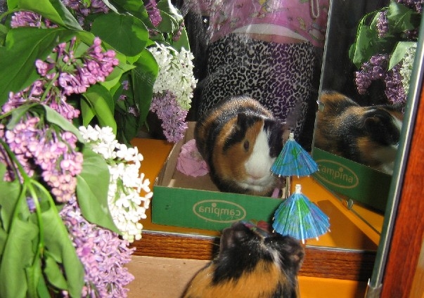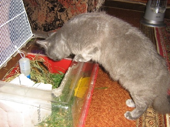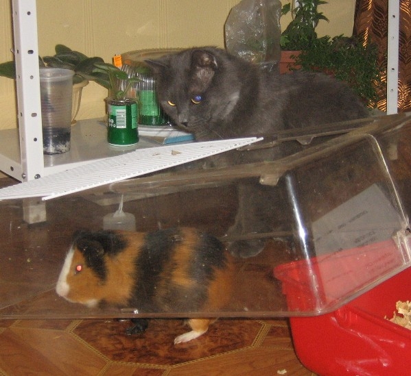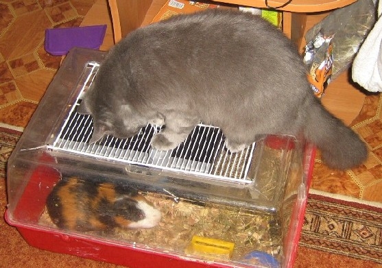 А кот, таки проявляет какой-то хищный интерес к свинтусу, но все безрезультатно. Но мы, на всякий случай, не оставляем без присмотра гулять Мишу в комнате где резвится кот. Только при нашем присутствии. Хотя пару раз забывали их в одной комнате, но все остались живы: или Мишка отбивался героически, или Смоки был не настойчив.