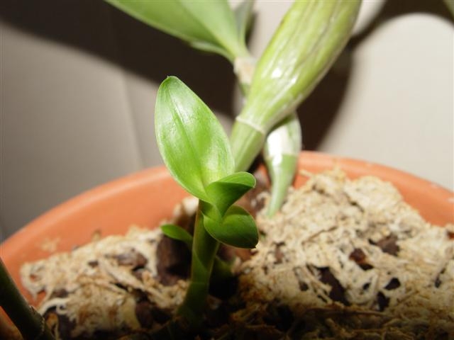 Жанн, это еще не листья, пока он вырастет, певые два листочка - в будущем будут покрывать бульбу - высохнут. Считаются только те листья, которые идут из верхушки псевдобульбы.