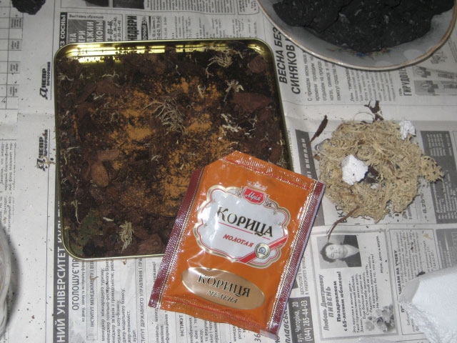 Субстрат со сфагнумом. В субстрат я добавила немножко пищевой корицы для предотвращения бактериоза.