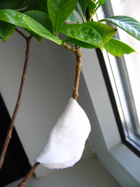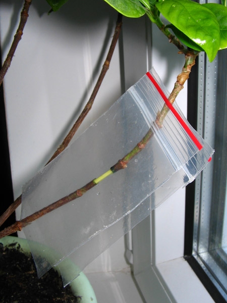 Смысл способа состоит в том, что у выбранной веточки срезается лезвием кольцо коры шириной около 1 см, надевается полиэтиленовый пакет, привязанный сверху и снизу разреза и наполненный землёй (сфагнумом, перлитом, любой другой смесью). Субстрат внутри пакета должен быть всегда влажный.