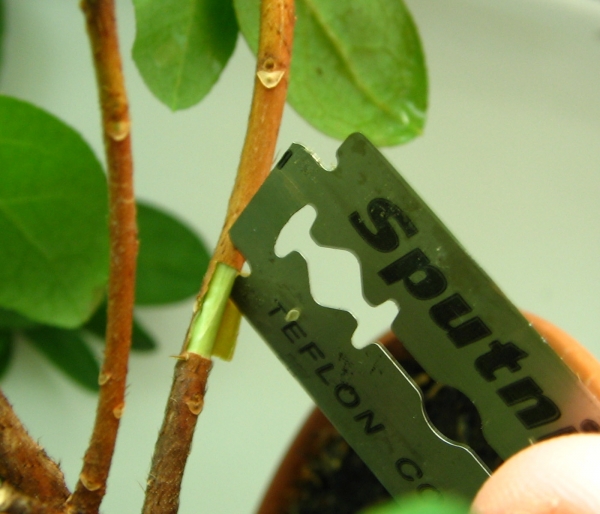 То же самое у Азалии. У Азалии кора тонкая, поэтому надрезать кору нужно очень аккуратно.