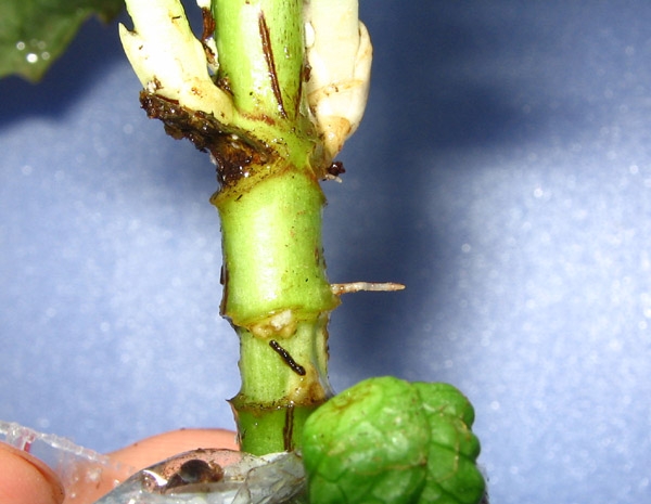Сегодня решила посмотреть, что делается с черенком Гортензии. Очень капризное растение в плане размножения :lol: за 5 недель всего три зачатка корня. Вот как это выглядит: