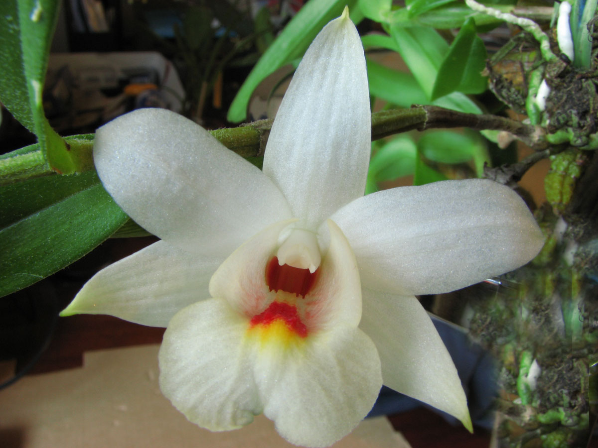 Пучок булавовидных коротких псевдобульб с 3 – 4 листочками, покрытыми снизу черными ворсинками. Цветение начинается поздней весной или в начале лета. Очень коротенький цветонос появляется в верней части псевдобульбы. Цветоносы могут появляться как на старых, так и на молодых псевдобульбах. Цветки крупные ( 5 см), очень ароматные.