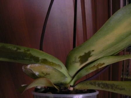 Вот фото второго подарка из этой серии,похоже на обморожение.Пострадали внешние листья,внутри хорошие.А налет-это плесень.Она и на опорной палочке внизу есть.