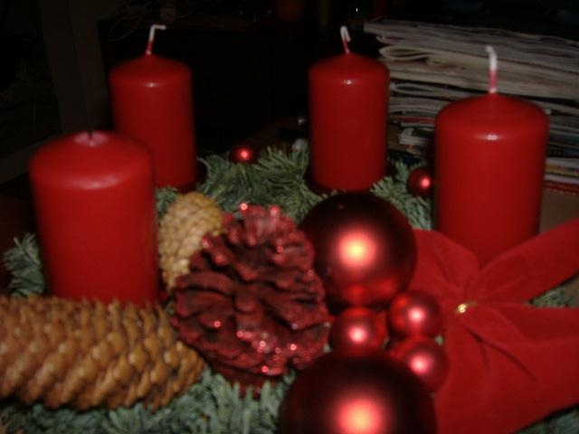 Давайте показывать свои ёлки и кто чем и как украшает!У нас, например ,24.12 было Рождество католическое и как тут положено, в этот вечер мы поставили ёлочку.Наскольkо я знаю,в это вpеmя многие ставят тоже и у нас,для детишек и не только.Если вы не против,то можно как-то типа новогодней темы сделать и показывать свои ёлки и новогодние украшения.Мне кажется,что это придаст настроения новогоднего!Ёлку я покажу завтра,хотя,честно сказать,она ничего особенного,её наряжал мой муж,а он сторонник обряжания старыми игрушками,и ничего американского,в смысле всё однотонное.А сейчас покажу,что сама сделала,венок,незню как обьяснить,тут так положено,за месяц до рождества зажигать в каждое воскресенье свечу,вобщем,еловый венок.В одной игре выиграла 1 место.