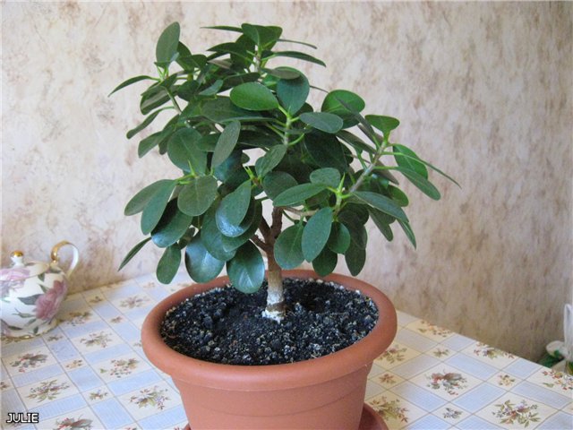Растет очень медленно,сразу же формируя толстые ветви и ствол. Очень похож на бонсай своим видом. В формирующей обрезке почти не нуждается. Листочки у него не блестящие,а покрытые тонким восковым налётом.